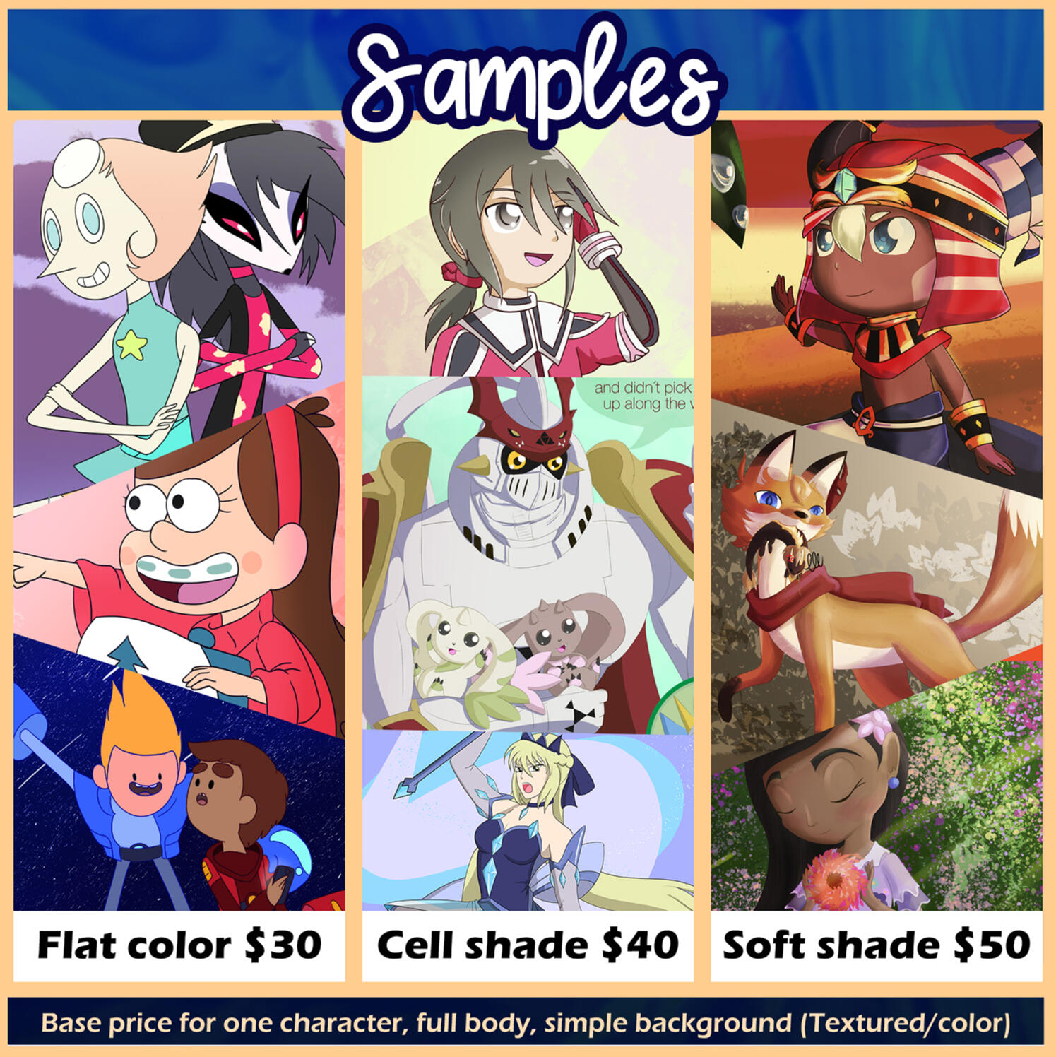 Prices are divided in three main services: Character design, layering (.PSD) and rigging.
